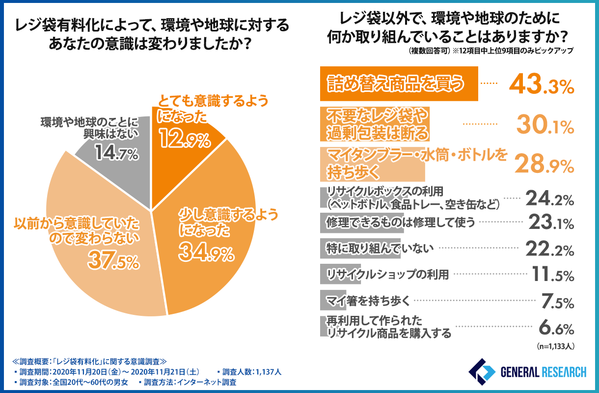この度、ゼネラルリサーチ株式会社(代表取締役:五條 寿朗、本社:東京都渋谷区)は、全国20代〜60代の男女を対象に、「レジ袋有料化」に関する意識調査を実施しました。